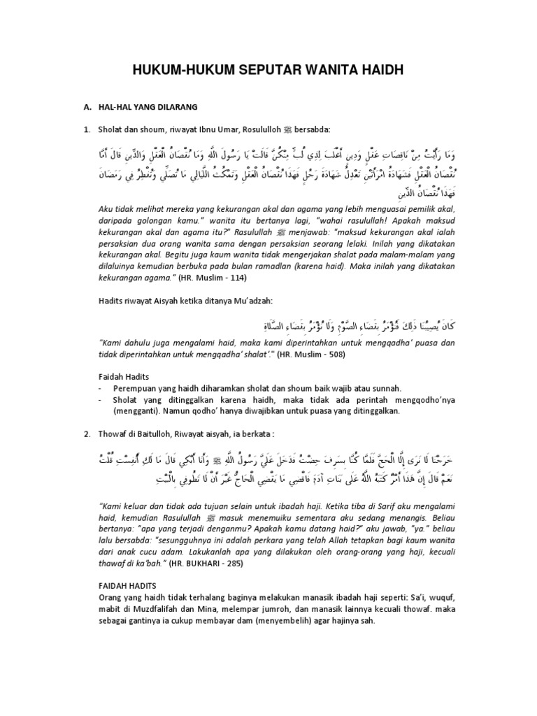 Kewanitaan Pusat Konsultasi Islam from santri.net Wanita haid, dalam islam ada hukum khusus yang berlaku pada mereka. Haid wanita paling sedikit sehari semalam (24 jam) dan tidak boleh lebih dari 15 hari. Dalam saat haid tersebut maka anda statusnya seperti orang yang jawaban. Sering muncul pertanyaan dibenak kita apakah seorang wanita yang sedang berhalangan atau sedang haid boleh memasuki masjid? 1.jika tidak kuatir darahnya mengotori (menetesi) masjid maka tidak haram melainkan hukumnya makruh jika tdak ada udzur atau hajat, jika ada hajat maka boleh masuk masjid. Yang tidak boleh adalah apabila masuk dan diam di dalam masjid. Namun bagaimana hukumnya jika wanita haid masuk masjid untuk mengikuti kajian islam. Hukum wanita haid masuk masjid, terdapat perbedaan pendapat.