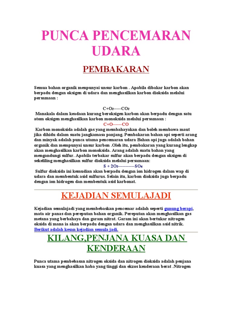 Puncak pencemaran udara adalah ketika semakin banyak kendaraan bermotor yang menghasilkan banyak sekali karbon dioksida (co2). Pencemaran pencemaran adalah perubahan ciri fizikal, kimia atau biologi persekitaran semula jadi yang tidak dikehendaki disebabkan oleh aktiviti manusia. Gangguan bekalan air | kilang punca pencemaran diarah roboh. Perkembangan dalam bidang ini menyebabkan penambahan pada pelepasan pencemaran gas organic dan bukan organic, bahan kimia dan juga habuk. Pencemaran udara merupakan satu keadaan yang melibatkan pengenalan sebarang bahan kimia, jirim zarahan atau bahan biologi yang boleh menyebabkan kemudaratan, ketidakselesaan kepada manusia atau organisma hidup lain serta.